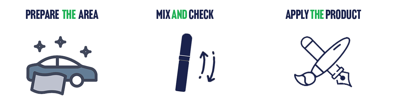 - Mixing & Colour Check - Shake the Paint Pen for at least 3 Minutes to ensure the paint is thoroughly mixed correctly (if your paint is a Metallic Paint, you may notice the paint has separated within the bottle, this paint will need a vigourous shake, then test in a discreet area to check the colour match leaving the paint to dry for 10 minutes – paints will often appear different in colour inside the bottle, when wet or if applied incorrectly.